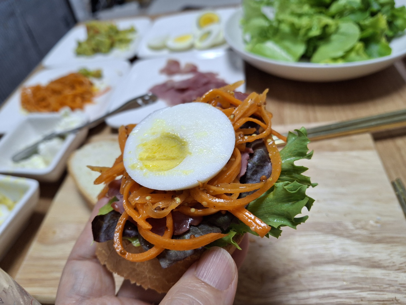 쪄놓고 남은 달걀,만들어 먹다 남은 당근라페,남은 베이컨1줄 모두 모아 나만의 조합으로 샌드위치를 만들어 먹어보았어요.