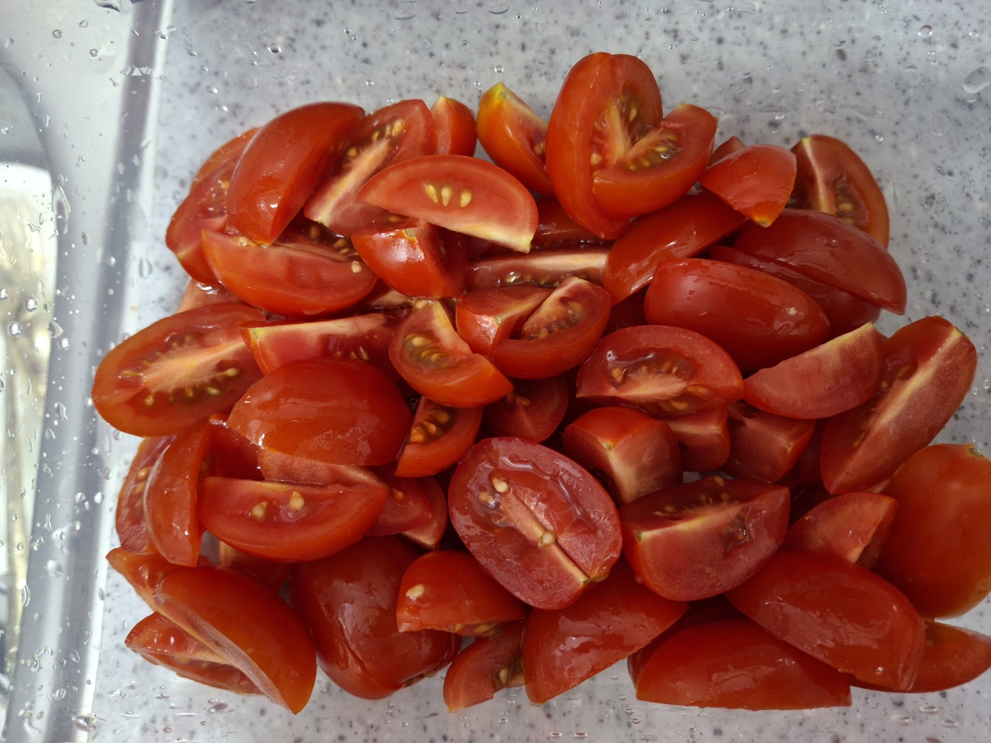 • 깨끗이 씻은 방울토마토를 반 또는 4등분으로 잘라 플라스틱통에 넣어 준비합니다.