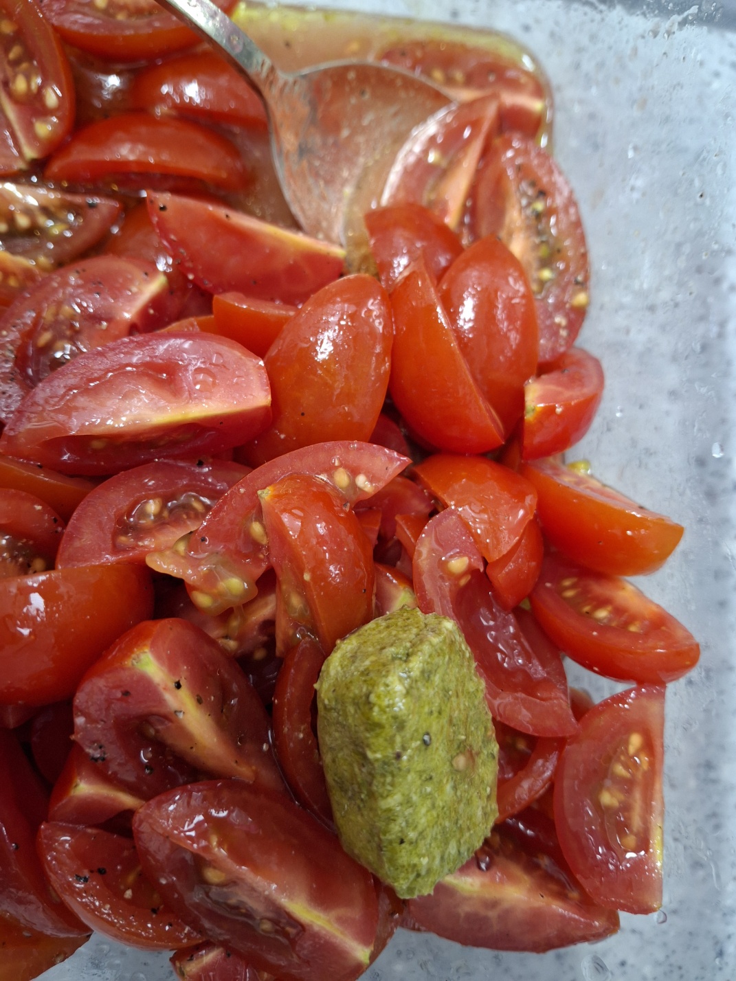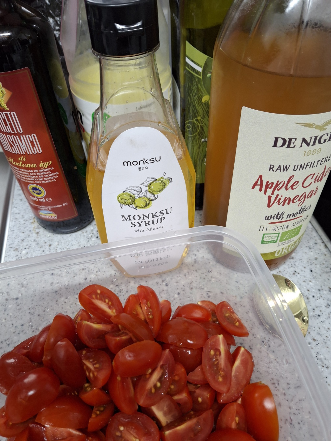 • 자른 방울토마토에 올리브유 3큰술,애플사이더 식초, 레몬즙, 알룰로스 각각 1큰술,소금, 후추를 넣고 골고루 섞습니다.