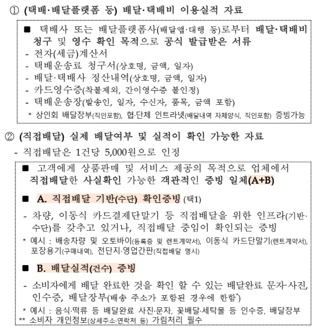 신청자 정보, 배달 일자, 배달 금액 등이 확인 가능한 전자세금계산서, 택배 운송장, 배달 정산 내역서 등을 제출