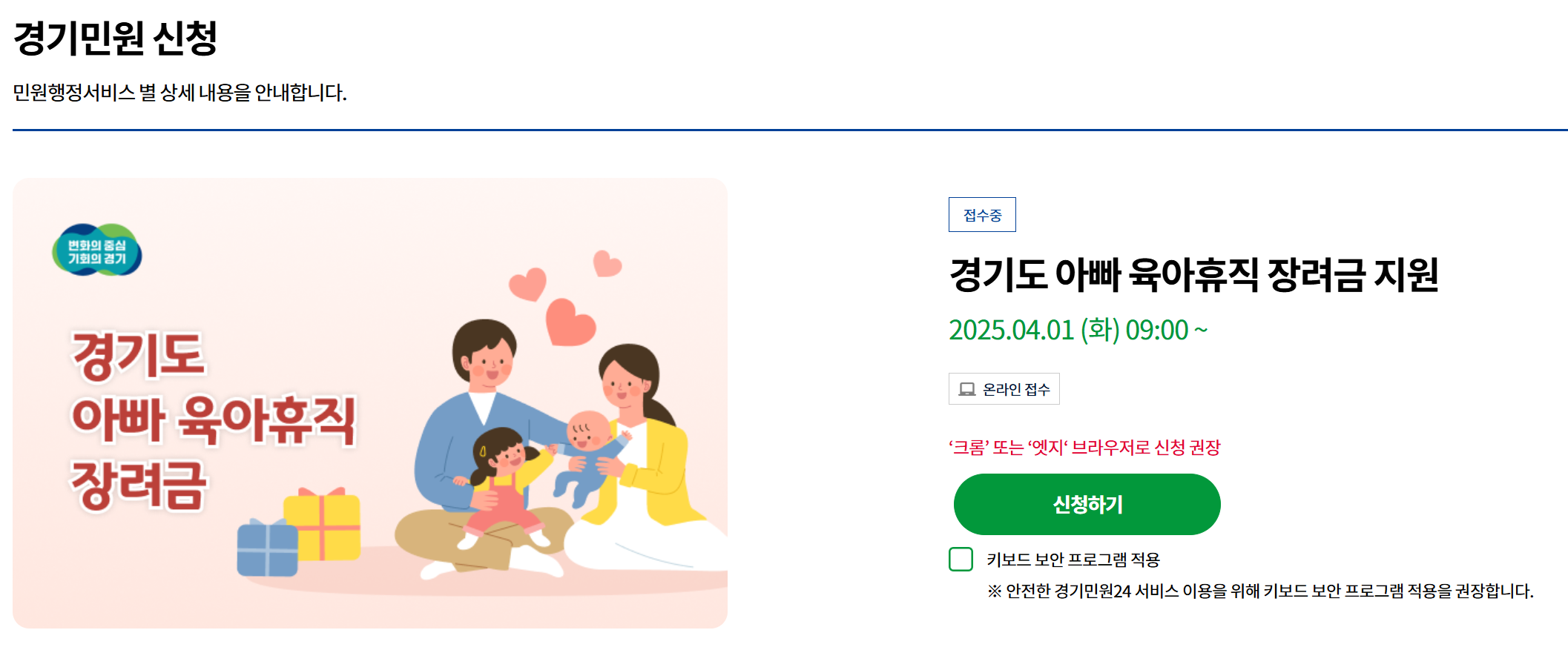- 지원 대상: 고용보험법에 따른 육아휴직 급여 수급자 중 가구소득이 기준 중위소득 150% 이하이며, 신청일 기준 해당 시군에 1년 이상 주민등록이 되어 있는 남성 육아휴직자
