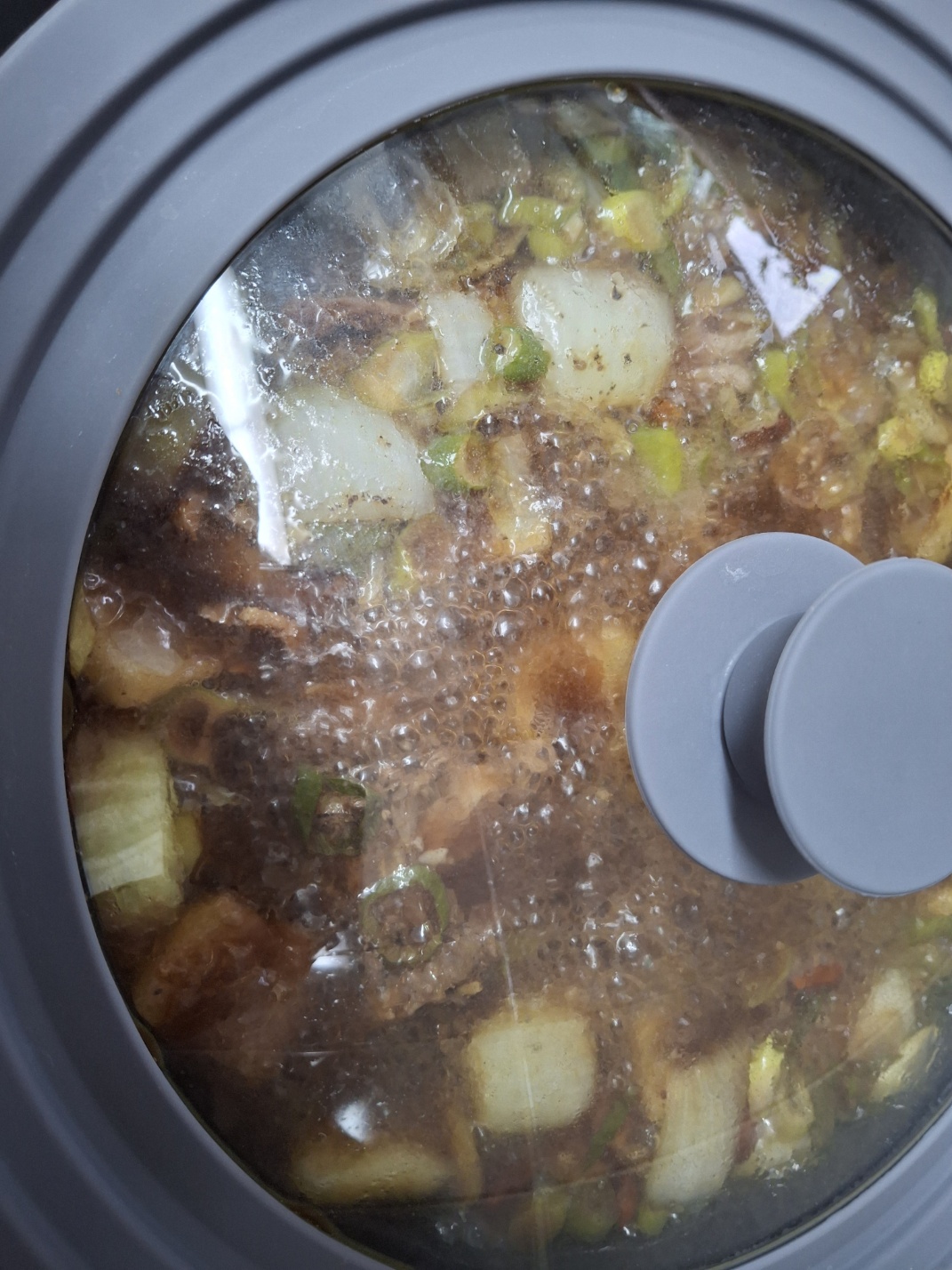 물 800ml를 넣고 식초 1스푼,후추 20바퀴를 넣은 후 뚜껑을 덮고 중불에서 15분 끓여줍니다. 중간에 가장자리에 동그랗게 썰어놓은 감자를 넣어줍니다. 식초는 잡내를 제거해주고 풍미를 살려준다고 해요.