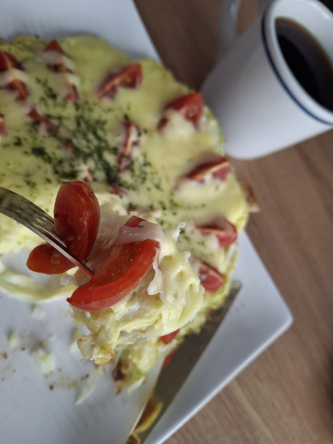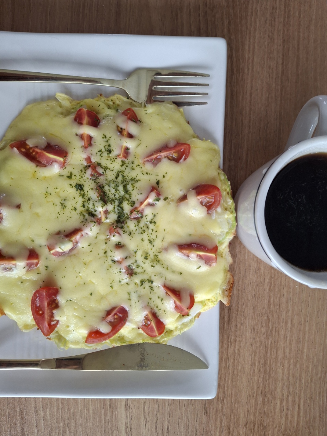 밑면은 계란 때문인지 많이 바삭하진 않고 부드러웠어요. 뒤집지 않고 익혀서 토마토와 양파의 맛이 그대로 느껴져 약간 심심하긴 했지만 먹을수록 재료 고유의 맛이 느껴지며 담백했고 치즈를 듬뿍 넣어서인지 나름 잘 어우러진 맛이 였어요.