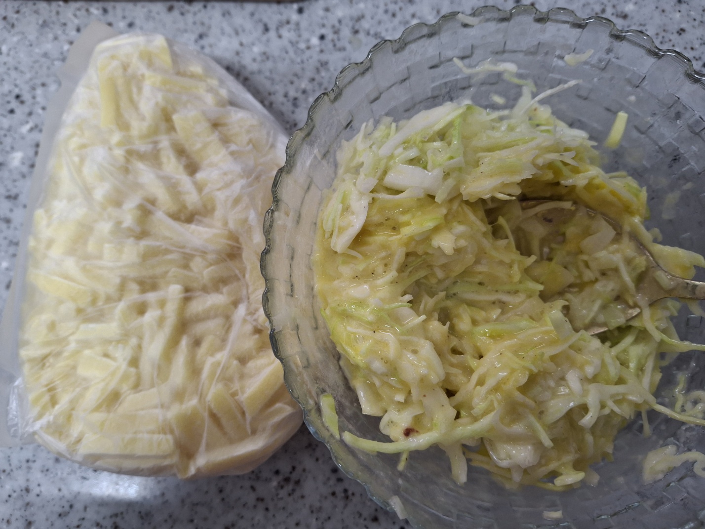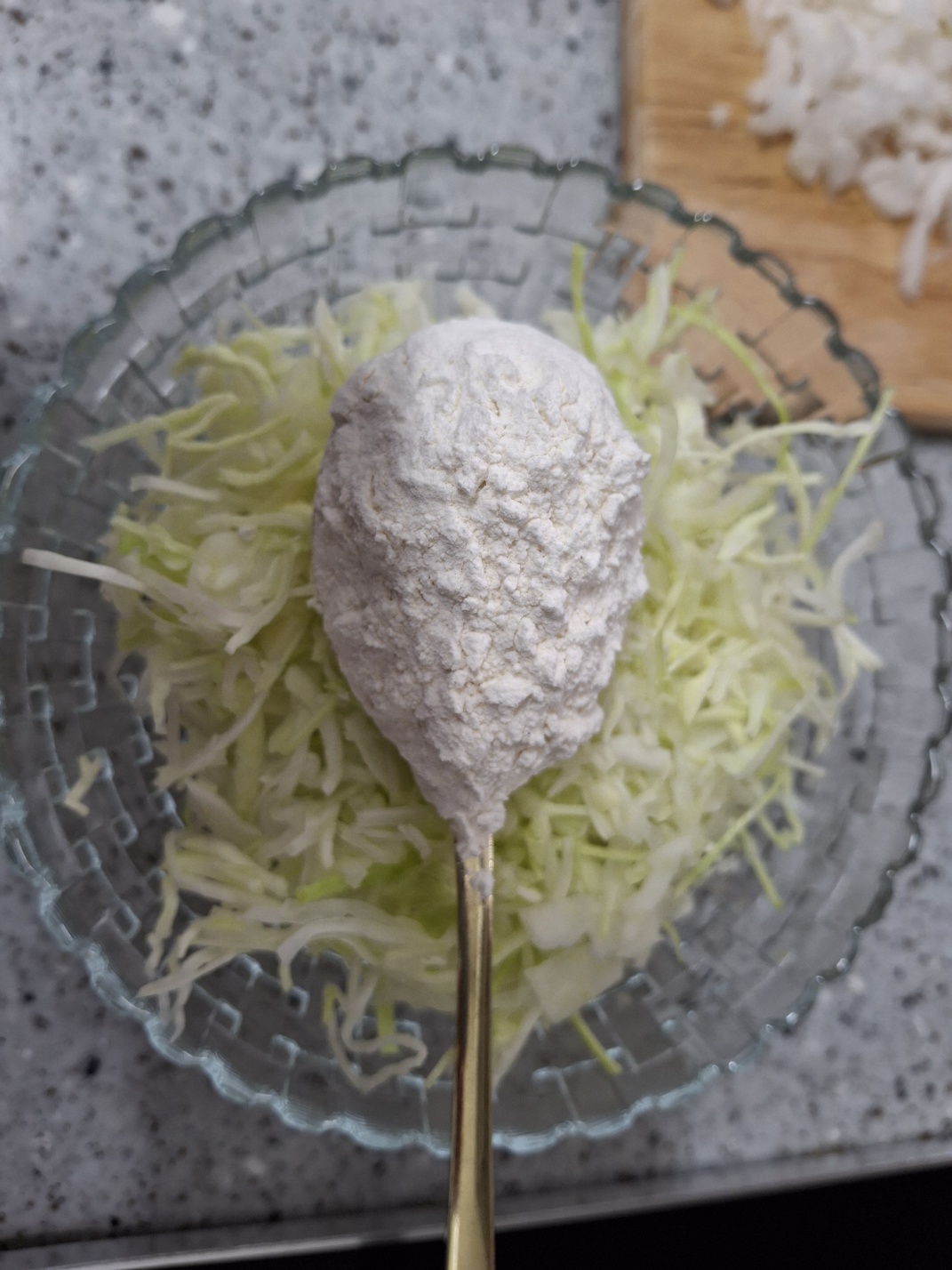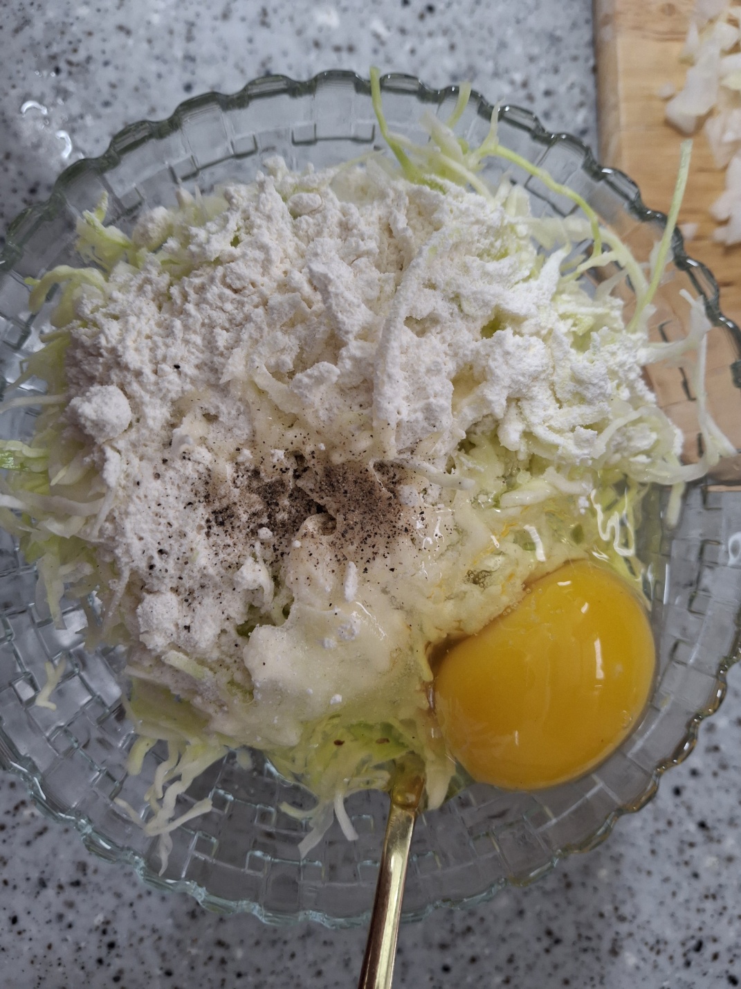 - 볼에 양배추, 양파, 부침가루(또는 밀가루), 달걀 1개, 소금, 후추를 넣어 잘 섞어줍니다.