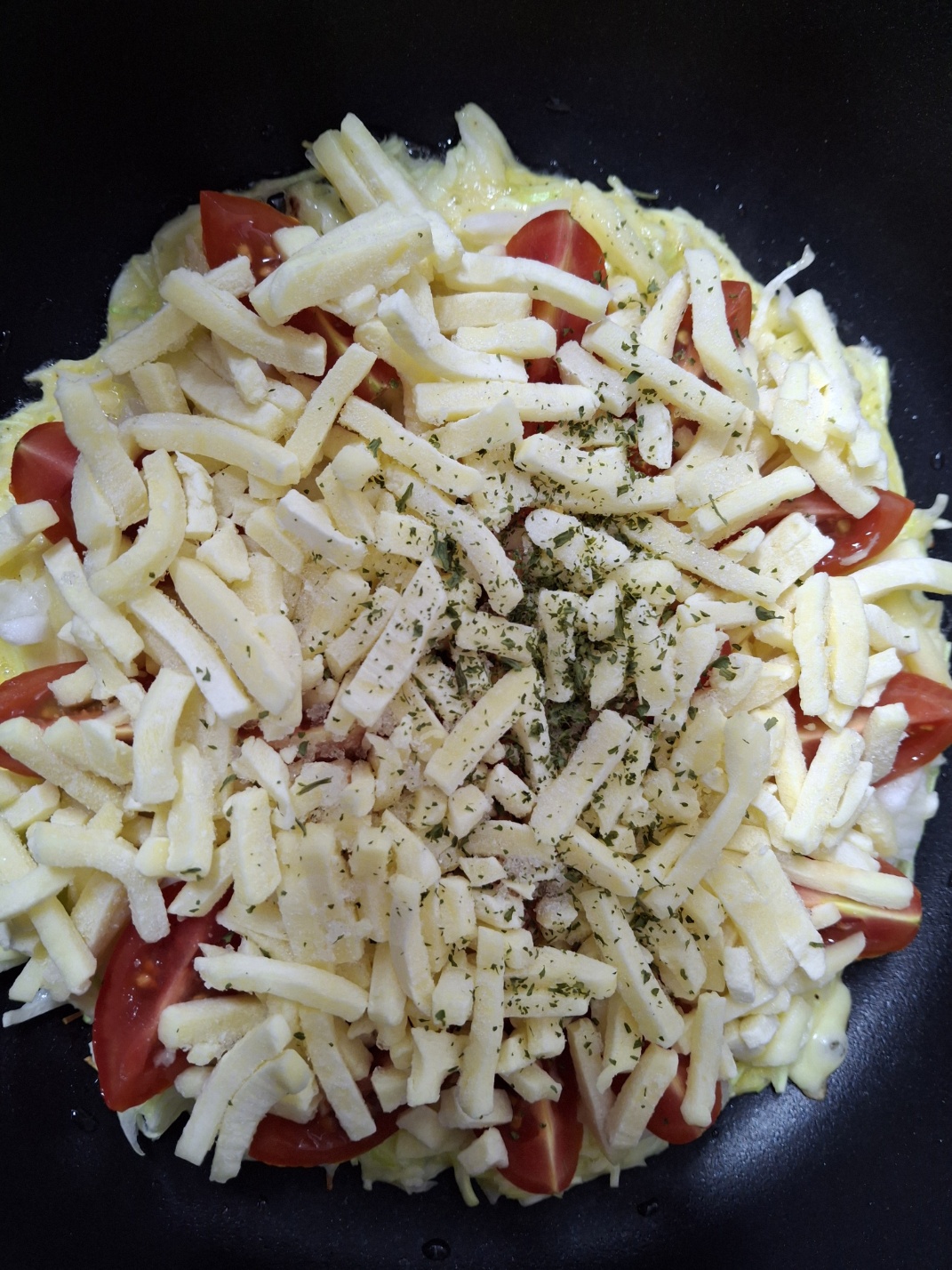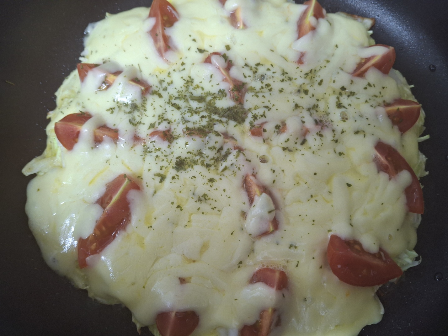 - 팬에 기름을 살짝 두르고 반죽을 펼쳐 올린 뒤 토마토를 올려주세요. 그 위에 치즈를 올리고 뚜껑을 닫아 약불에서 치즈가 녹을 때까지 익힙니다.