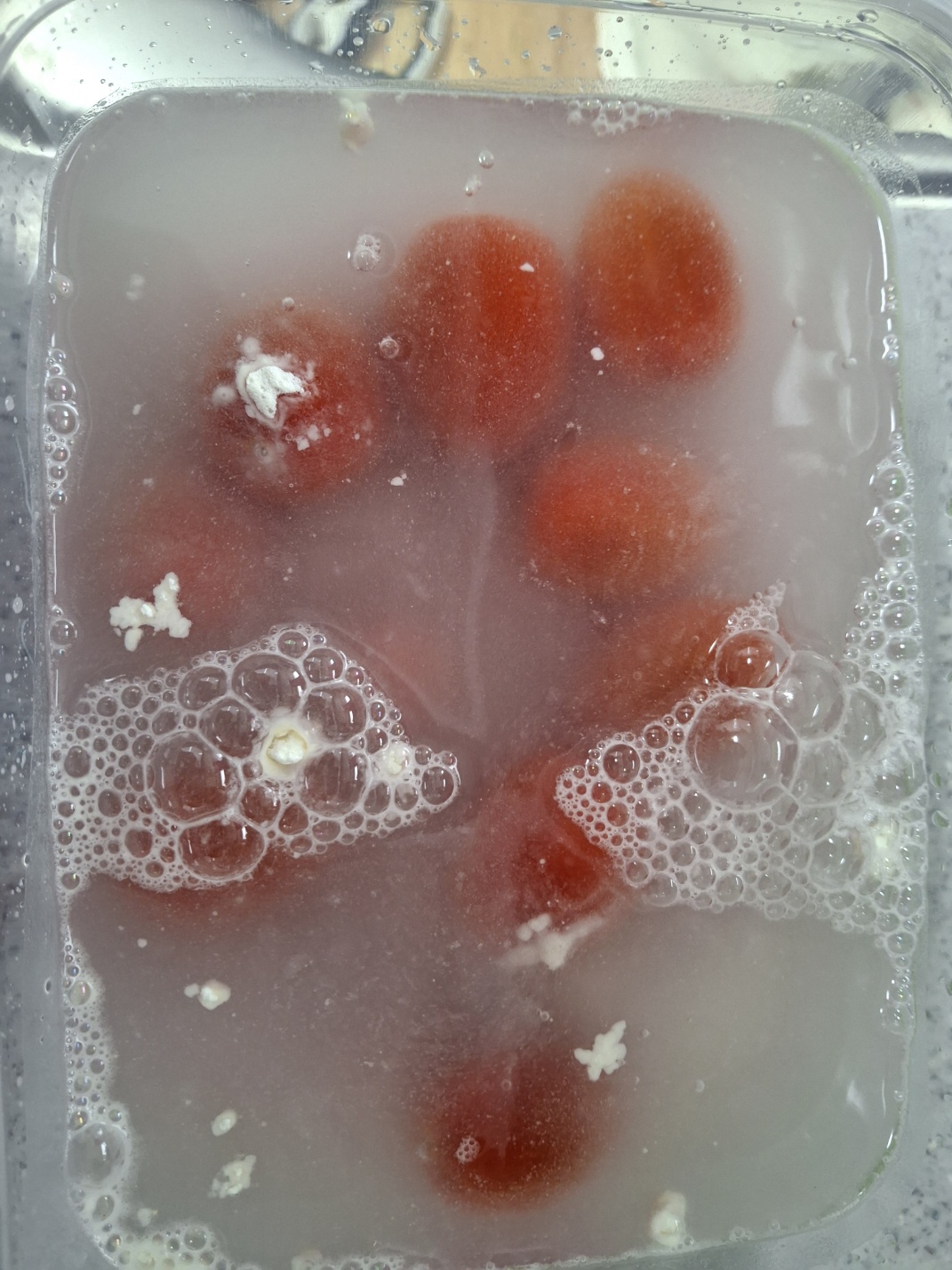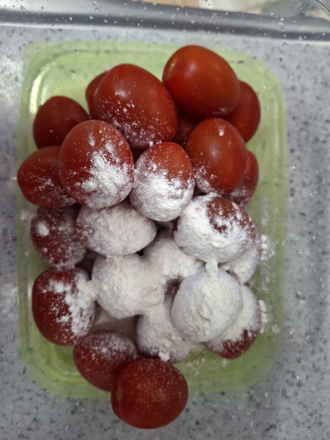 - 토마토는 플라스틱통에 밀가루를 넣은 후 세척합니다.
