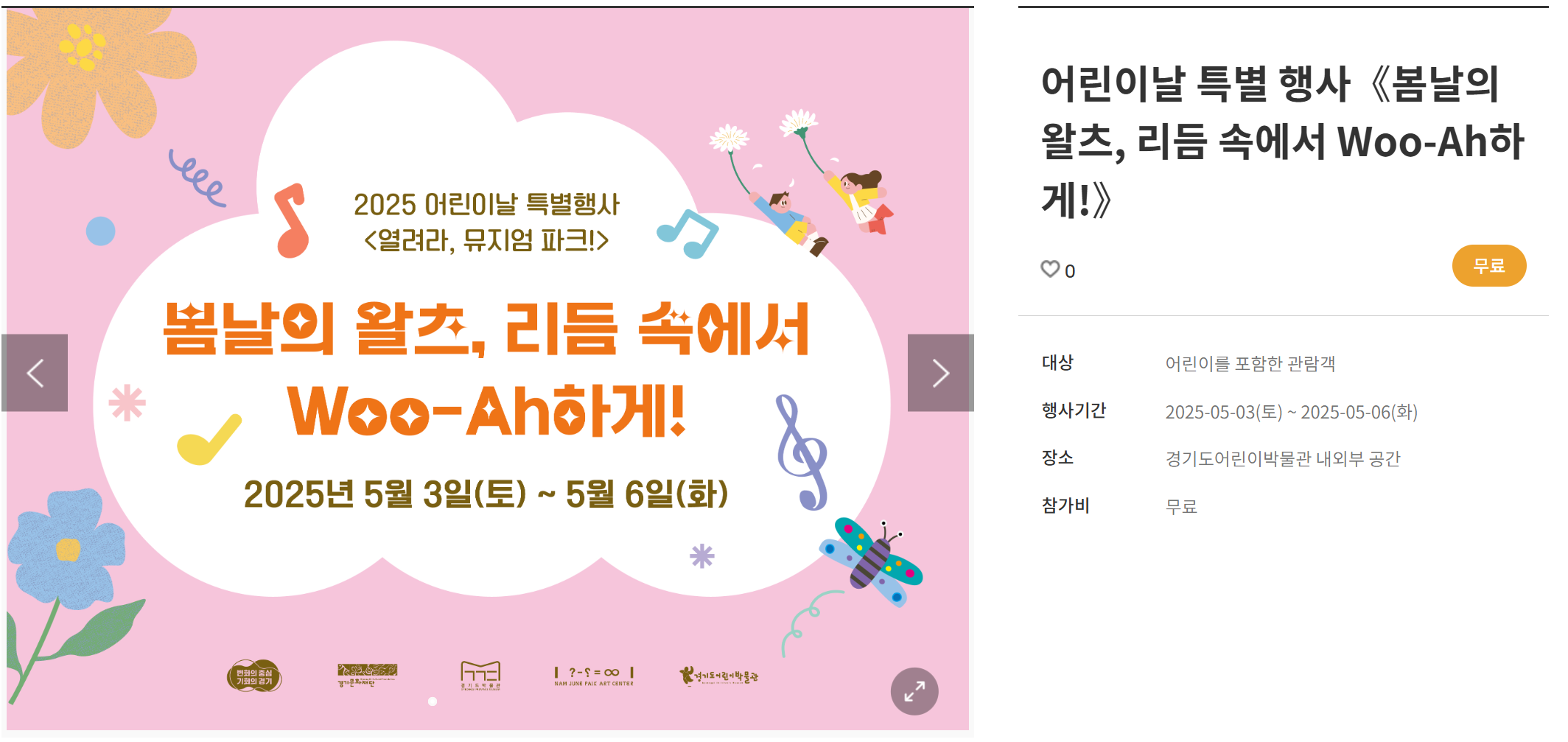 | 경기도어린이박물관 행사 | 5.3 ~ 5.6 | 용인시 기흥구 | 열려라 뮤지엄파크 |