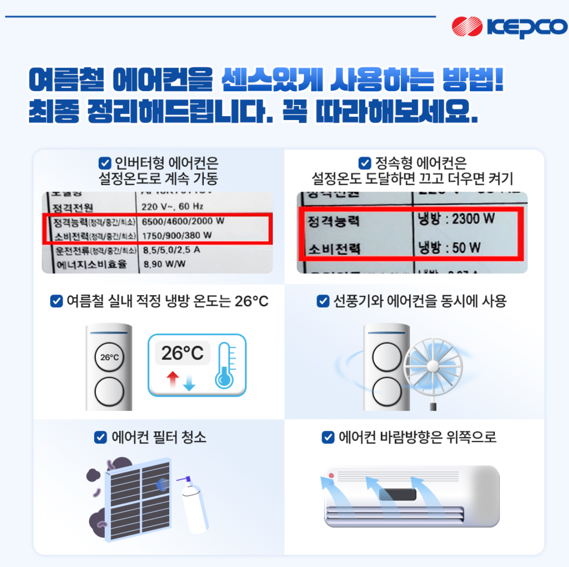 - 냉방 온도 설정: 에어컨은 26~28도로 유지