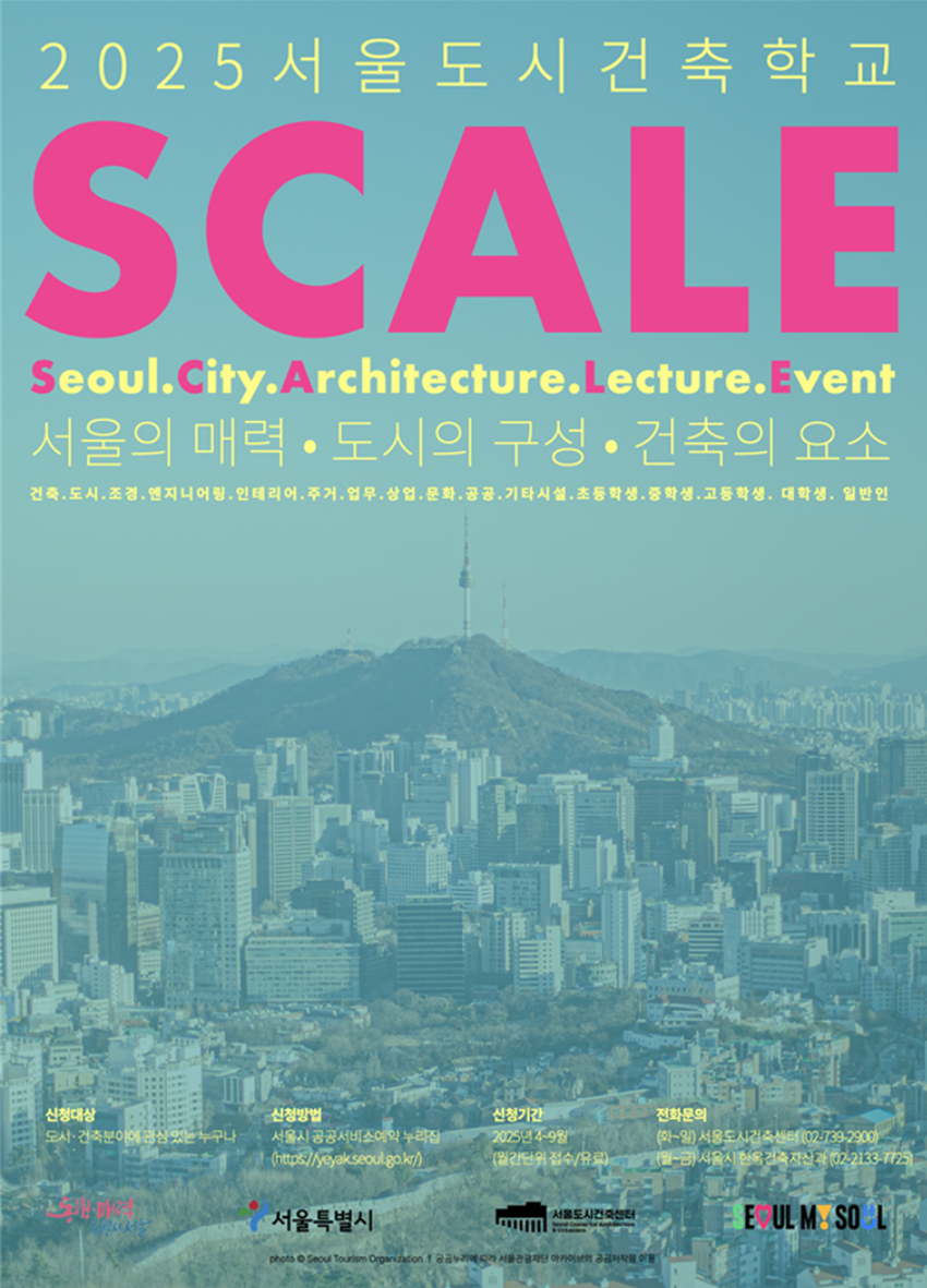 2025년 서울도시건축학교는 ‘SCALE’이라는 브랜드명 아래 세 가지 대주제, 즉 서울, 도시, 건축을 중심으로 구성됩니다. ‘SCALE’은 Seoul City Architecture & Lecture Event의 약자로, 도시건축의 ‘축적’ 개념까지 포함한 상징적인 이름입니다.